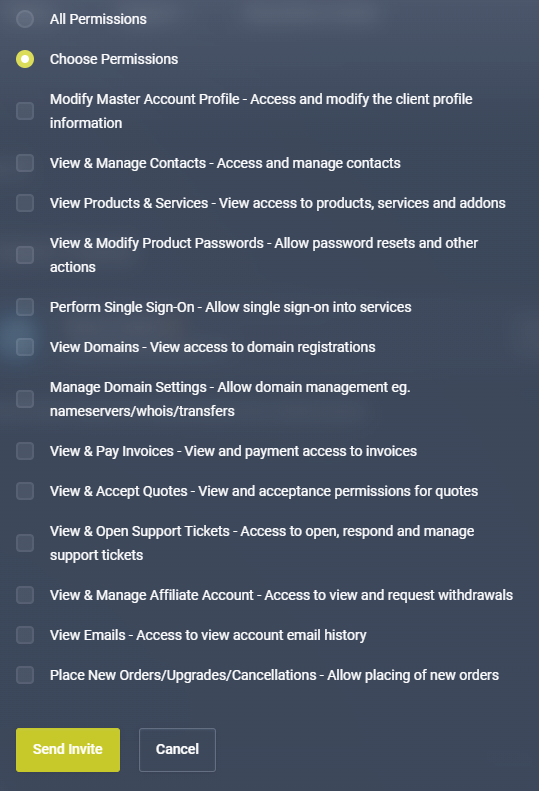 Note: Do not give a Sub-User “All Permissions” unless you are comfortable with them having complete control over your Billing Panel.