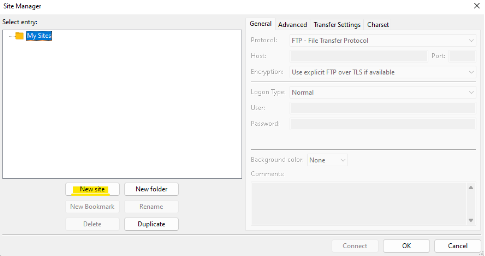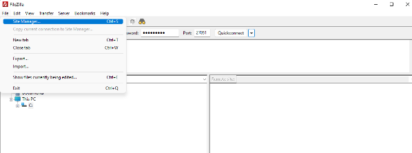 Open the Filezilla application, select Site Manager under the File bar.